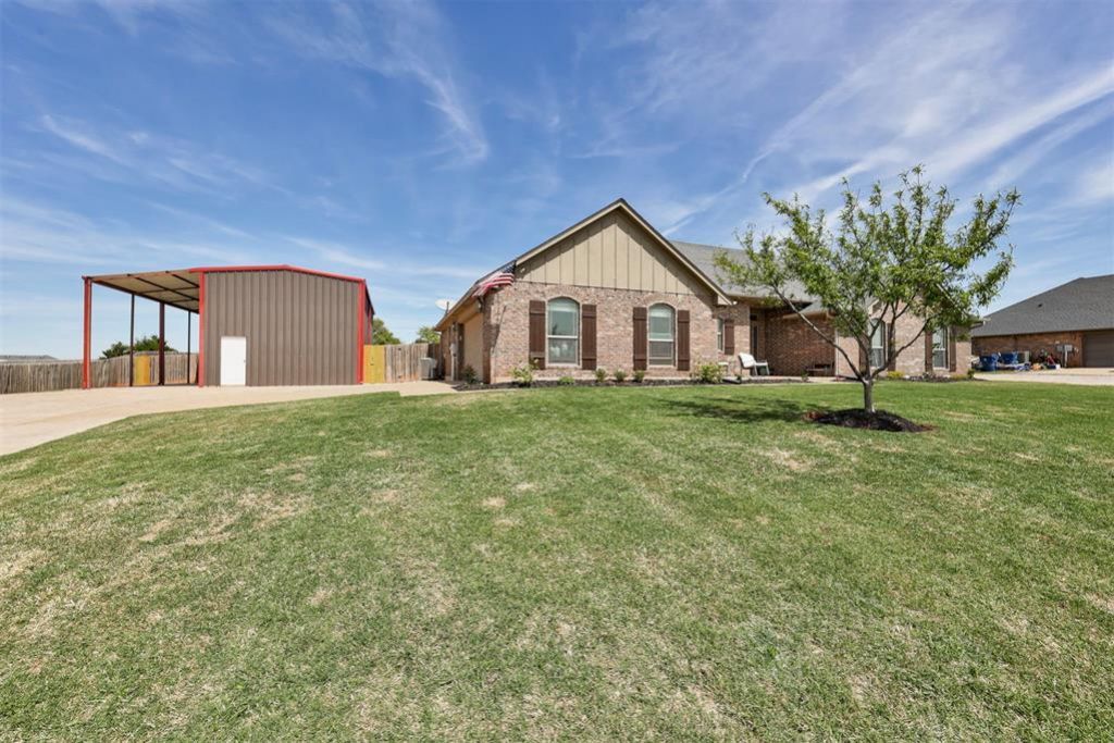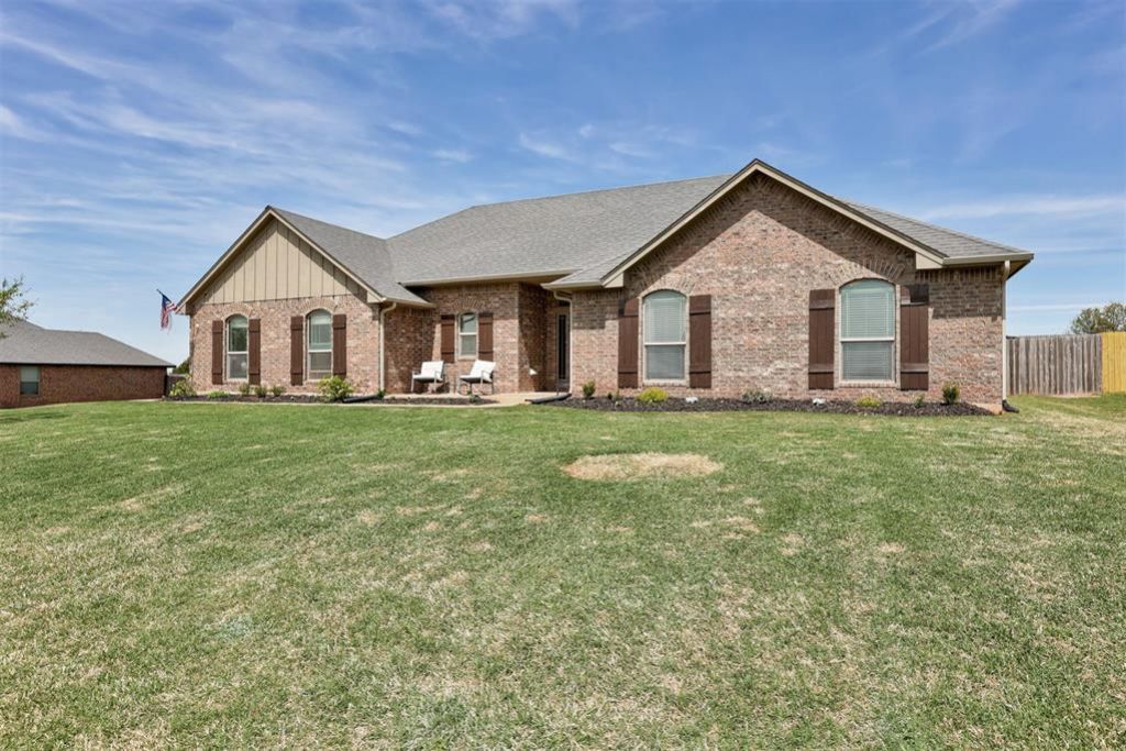 This beautiful 4-bedroom, 2-bath home set on over an acre, complete with a large shop (approx. 20 x 40 w/15-foot walls) and a lean-to (approx. 12 x 40)-perfect for hobbies, storage, or workspace. An oversized concrete driveway makes access to the shop and garage effortless, adding convenience to your everyday routine. Thoughtfully maintained landscaping lines the front of the home, guiding you to a spacious front porch where you can relax and unwind while taking in peaceful views of trees on the horizon. Inside, you're welcomed by a spacious entry with ideal space for a drop zone and charming arched openings that lead into the main living areas, adding warmth and character. The open-concept living room features high ceilings, abundant natural light, and plenty of room to gather and entertain. The dining area flows seamlessly from the living space and offers ample room for a large table, with easy access to the expansive back patio-perfect for extending your living and entertaining outdoors. The kitchen is well-appointed with generous upper and lower cabinetry, a center island for added workspace, a full-size pantry, built-in stainless steel appliances, and granite countertops that tie the space together beautifully. Privately situated on its own wing, the primary suite offers a peaceful retreat with a spacious layout, high ceilings, abundant natural light, and a walk-in closet. The en-suite bathroom features a double vanity, linen storage, and a walk-in shower, creating a comfortable and functional space to unwind. On the opposite side of the home, you'll find three secondary bedrooms, each generously sized with high ceilings and large closets. A well-designed secondary bathroom offers timeless finishes and plenty of storage. The backyard is your own private oasis, offering endless possibilities. The oversized patio provides ample space for entertaining, while the expansive yard leaves room for activities, additions, or future customization to fit your lifestyle